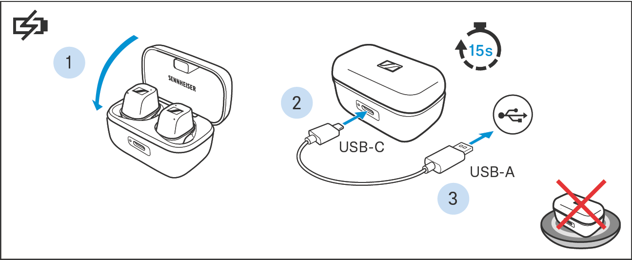 耳机和充电盒被唤醒,电池开始充电。现在可以使用耳机。
